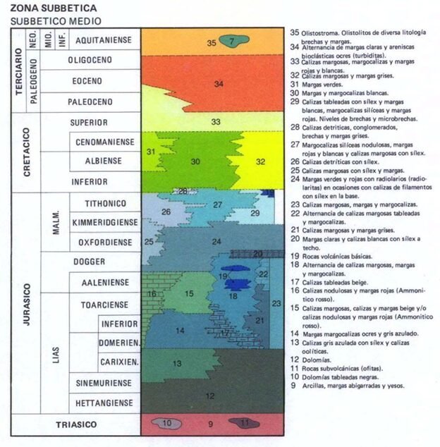 - Subbético. Localizado en la parte más meridional de las Zonas Externas y magníficamente representado en la provincia de Granada, de la que ocupa la mitad meridional. Está constituido por sedimentos marinos profundos de carácter pelágico, es decir, lejanos de la costa. Aunque, de norte a sur, se pueden subdividir en varios dominios paleogeográficos, globalmente se pueden diferenciar tres grandes conjuntos litológicos: los materiales triásicos, mayoritariamente arcillas, arenas rojas y yesos; los grandes afloramientos jurásicos y cretácicos de calizas y margas; y las margas y depósitos turbidíticos del Terciario.
