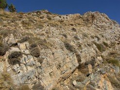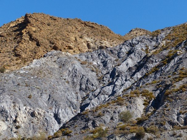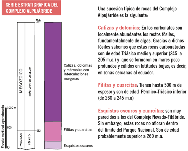 - Calizas y dolomías. Son rocas calcáreas compuestas mayoritariamente por carbonato de calcio. Las calizas se forman actualmente en mares cálidos y poco profundos de las regiones tropicales, donde los aportes detríticos son escasos. Se generan en forma de lodos carbonatados procedentes de la acumulación, durante cientos de miles o millones de años, de esqueletos calcáreos de organismos marinos. Posteriores procesos de carácter químico le conferirán el carácter pétreo. Cuando tienen una alta proporción de carbonatos de magnesio, que pueden sustituir parcialmente al calcio, se llaman dolomías. Las calizas y dolomías alpujárrides han sufrido procesos de metamorfismo que enmascaran sus características originales, recristalizando parcialmente, a veces de forma intensa, hasta transformarse en calizas marmóreas e incluso en mármoles. Otra característica es su intensa fracturación y en ocasiones grado de karstificación, que las convierten en excelentes acuíferos. En ocasiones, generan relieves de morfología muy singular, como los calares.