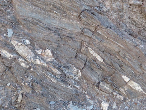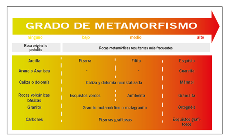 - Micaesquistos y cuarcitas. Son las rocas más frecuentes en este complejo. Los esquistos proceden de antiguos sedimentos arcillosos y las cuarcitas de sedimentos arenosos. Los procesos metamórficos hacen que los minerales cristalicen en formas laminares cuya orientación produce el típico aspecto hojoso de los esquistos. Cuando son oscuros, se debe a la presencia de cierto contenido de materia orgánica, que en el proceso metamórfico llega a convertirse en grafito.