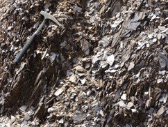 - Pizarras y filitas. Rocas de metamorfismo de bajo grado, procedentes de arcillas, que manifiestan una esquistosidad muy patente y, generalmente, un brillo satinado característico. En Sierra Nevada adquieren colores muy vivos y llamativos, de tonos azul y violáceo. Se les denomina localmente launas y, por su carácter extremadamente impermeable, se han usado históricamente en la construcción de los techos planos de las casas tradicionales.
